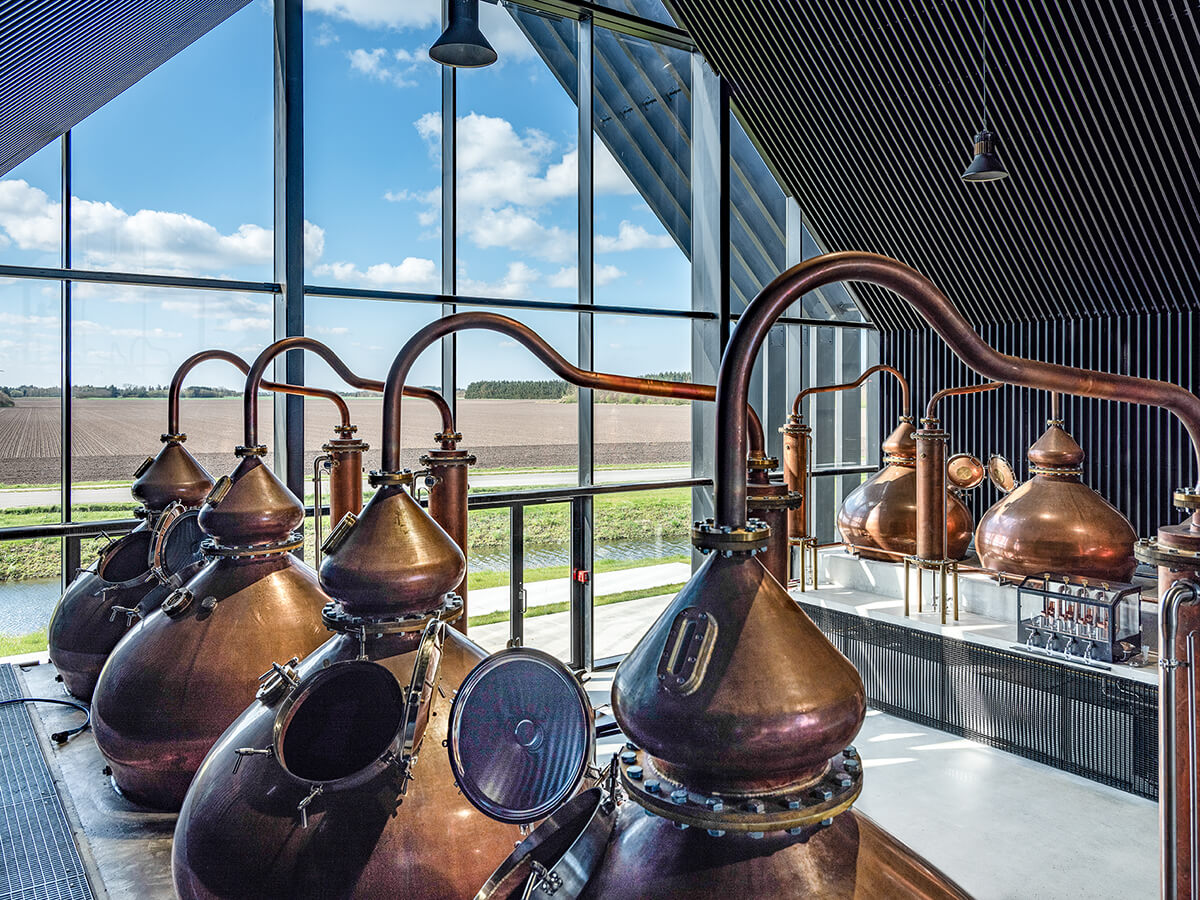 Stauning’s spirit is double distilled in small direct fired copper pot stills, 24 of them.